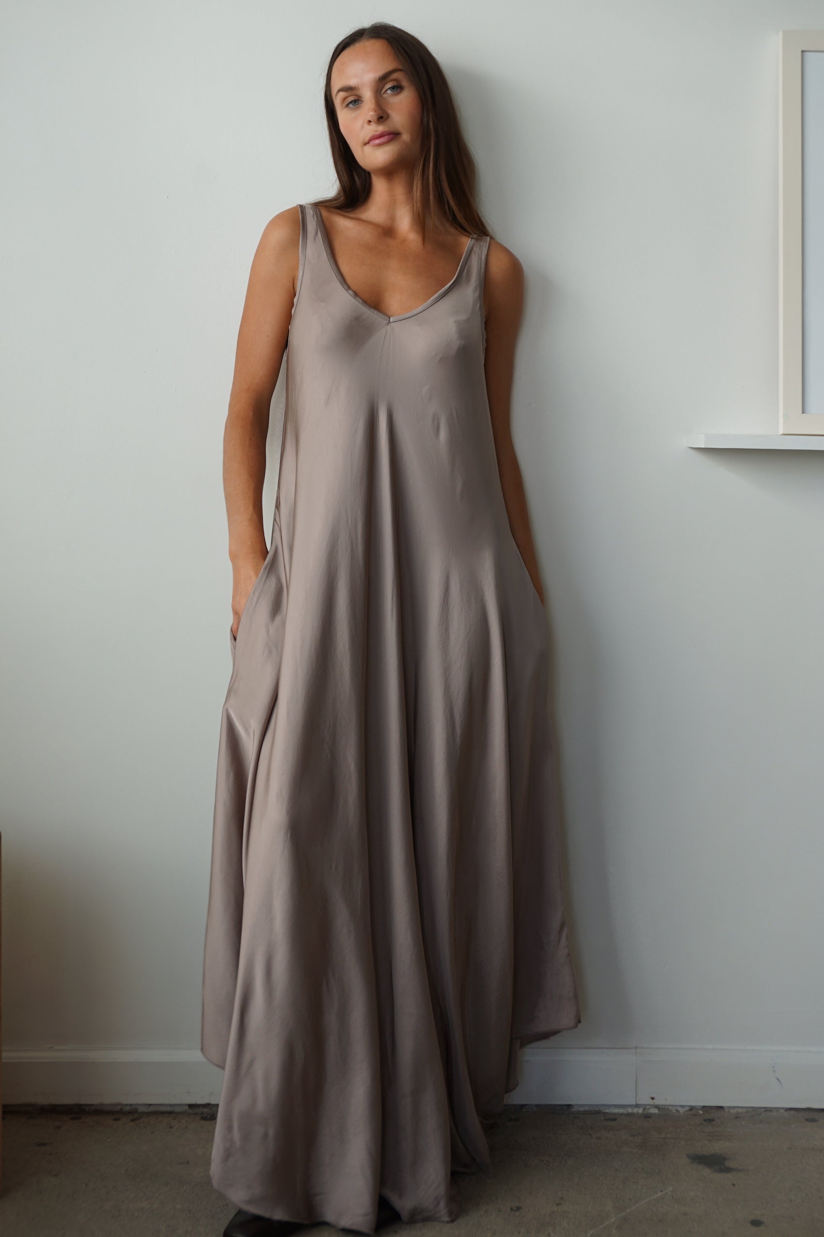 Satin maxi dress with scooped bottom hem and pockets. V front and back neckline.